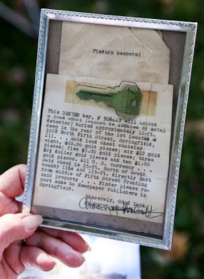 Henken's life got interesting in May when, while prying off the seat of a rickety rocking chair she bought at auction five months earlier, she discovered a small envelope with "Finders Keepers" typewritten on it. Inside, a key was taped to a typed note. "This DEXTER key (number sign) 50644T will unlock a lead chest," the note began, before spelling out a location in Springfield — 1028 N. Fifth St. — where a chest containing more than $250 in U.S. gold coins supposedly was buried 12 feet below ground. The stash, the note claimed, included eight $20 gold pieces, six $10 gold pieces, five $5 gold pieces, three $2 1/2 dollar gold pieces and two $1 gold pieces. The undated note, signed by a "Chauncey Wolcott," included a request to contact the Springfield newspaper if the chest was ever found.